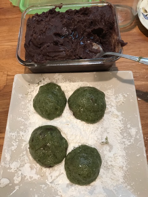 お餅を蒸して、採ってきたよもぎを茹でて、細かくしたものと一緒にあわせます。