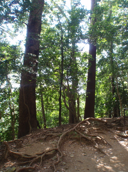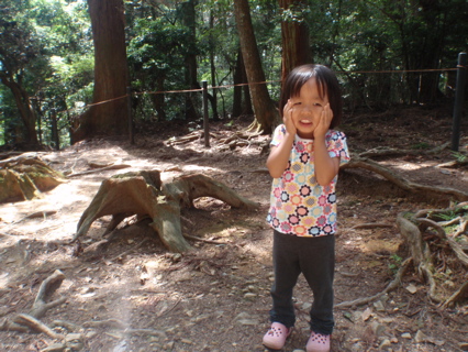 娘も一生懸命登ってくれました。そして、象に似ている切り株発見!ママ、一緒に写真撮ってー。と言いながら、最近の彼女のはやりの a silly face をして、はい!チーズ!