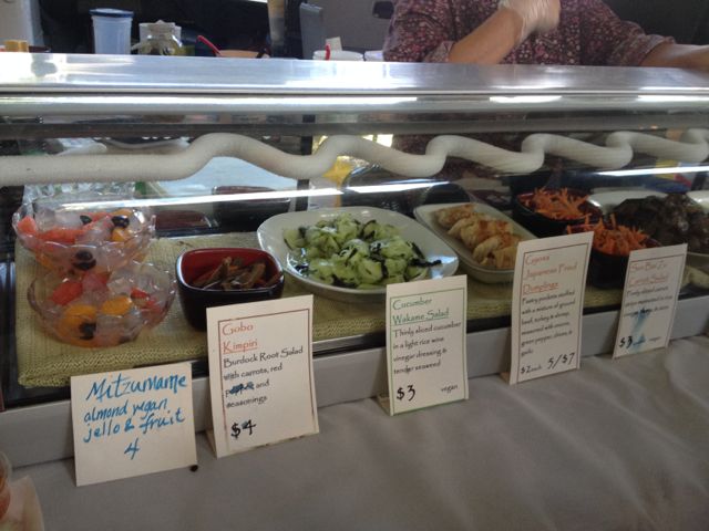何を売っているのか見てみると、みつ豆、きんぴらごぼう。これはまさに日本食だ!!アメリカにいると、日本人以外の人が作る、とっても恥ずかしい日本食を良く見かけますが、これは本物の日本食です!!